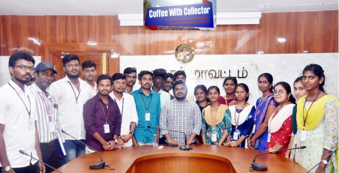 விருதுநகர் மாவட்ட ஆட்சியர் அலுவலக கூட்டரங்கில் (14.03.2025) கிருஷ்ணன்கோவில் கலசலிங்கம் கலை மற்றும் அறிவியல் கல்லூரியில் பயின்று வரும் 60 மாணவ, மாணவியர்களுடன் நடைபெற்ற "Coffee With Collector” என்ற 155- வது கலந்துரையாடல் நிகழ்ச்சியில் மாவட்ட ஆட்சித்தலைவர் முனைவர் வீ.ப.ஜெயசீலன்,I A S., அவர்கள் மாணவர்களுடன் கலந்துரையாடி, கல்லூரிகள் தேர்வு, உயர்கல்வி, வேலைவாய்ப்பு மற்றும் சுற்றுச்சூழலின் முக்கியத்துவம் குறித்த உரிய வழிகாட்டுதல் வழங்கினார்.