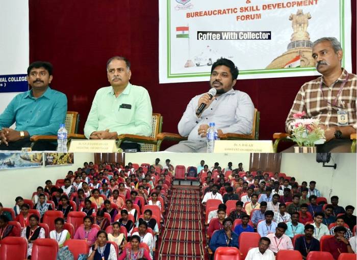 விருதுநகர் மாவட்டம், சிவகாசி அய்யநாடார் ஜானகி அம்மாள் கல்லூரியில் (19.03.2025) சிவகாசி அய்யநாடார் ஜானகி அம்மாள் கல்லூரியில் பல்வேறு துறைகளில் பயிலும் 100-ற்கும் மேற்பட்ட கல்லூரி மாணவர்களுடனான "Coffee With Collector” என்ற 158- வது கலந்துரையாடல் நிகழ்ச்சியில் மாவட்ட ஆட்சித்தலைவர் முனைவர் வீ.ப.ஜெயசீலன், I A S., அவர்கள் மாணவர்களுடன் கலந்துரையாடி, கல்லூரிகள் தேர்வு, உயர்கல்வி, வேலைவாய்ப்பு மற்றும் சுற்றுச்சூழலின் முக்கியத்துவம் குறித்த உரிய வழிகாட்டுதல் வழங்கினார்.விருதுநகர் மாவட்டத்தில் பள்ளி மற்றும் கல்லூரியில் பயிலும் மாணவ / மாணவியர்களுடன் கல்வி, பொது அறிவு, விளையாட்டு, ஓவியம், இசை உள்ளிட்ட பல்வேறு திறன் அடிப்படையில் மாணாக்கர்களின் திறன்களை கண்டறிந்து, மாணவ, மாணவியர்கள் தேர்ந்தெடுக்கப்பட்டு பிரதி வாரம் ஒருமுறை அவர்களை மாவட்ட ஆட்சித்தலைவர் அவர்கள் நேரில் அழைத்து கலந்துரையாடும் நிகழ்ச்சி தொடங்கப்பட்டு, இன்று 158-வது முறையாக கலந்துரையாடல் நிகழ்ச்சி நடைபெற்றது.